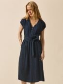 • V-neckline, button placket to the elastic waist, gathered shoulders drape creating a short-sleeve effect