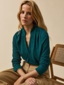 A blended fabric with the authentic look of linen but a more flowing drape. This T-shirt is styled like a cardigan with a ruffled note that delivers charming everyday chic.